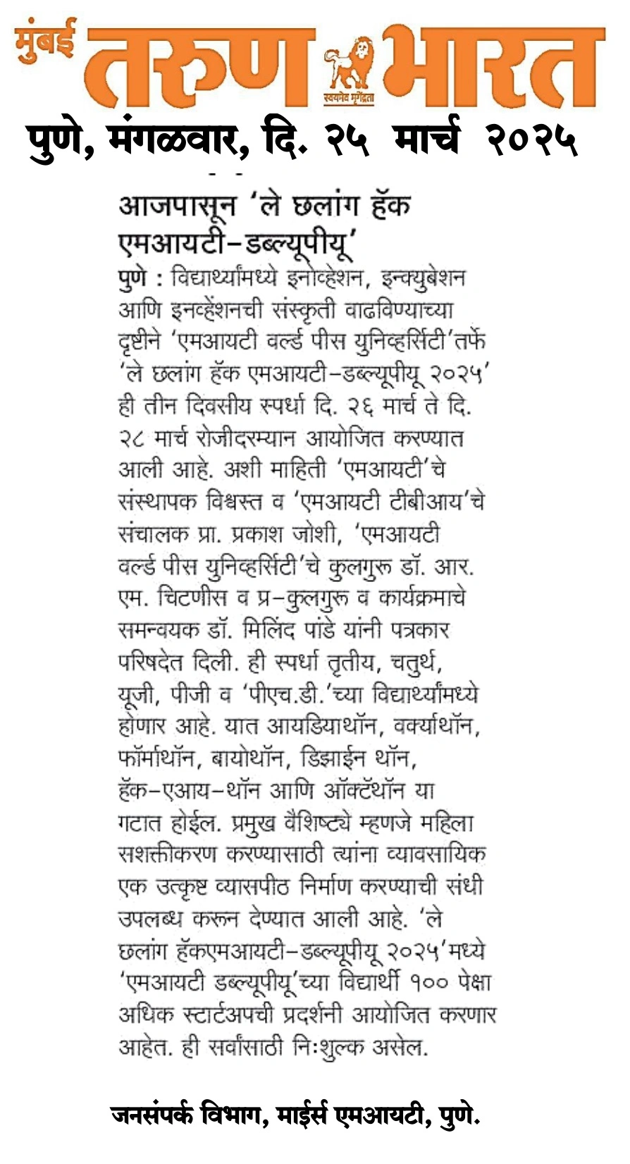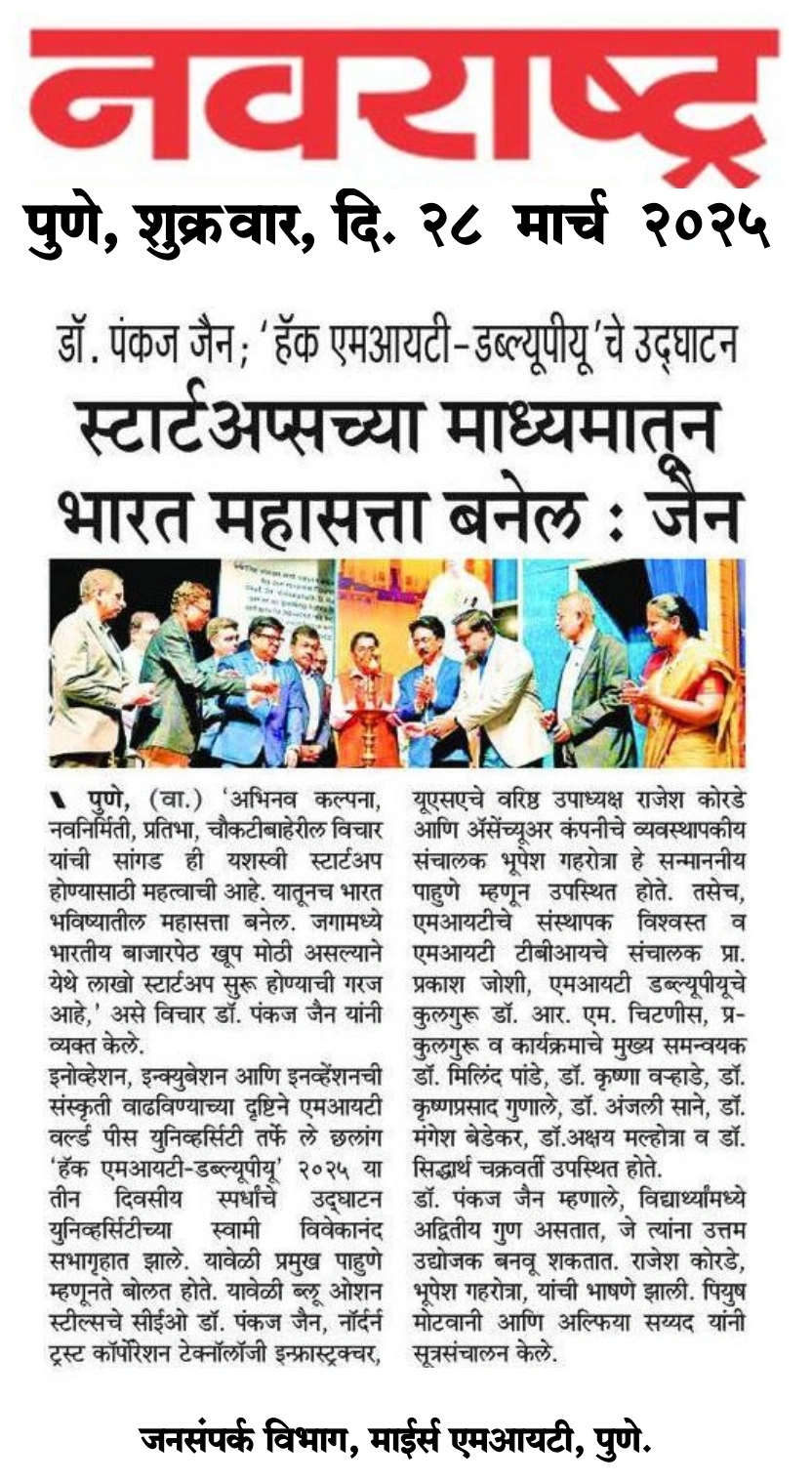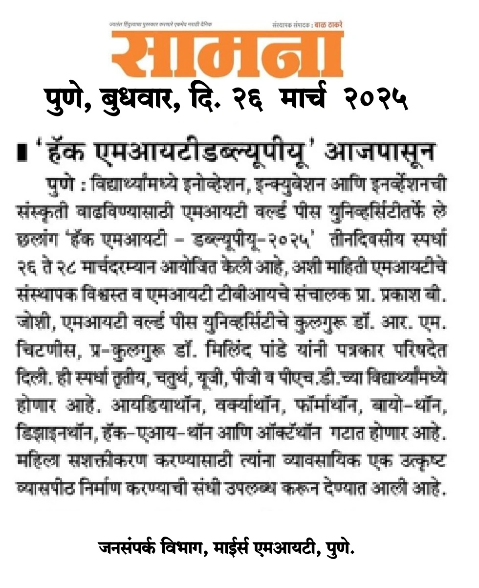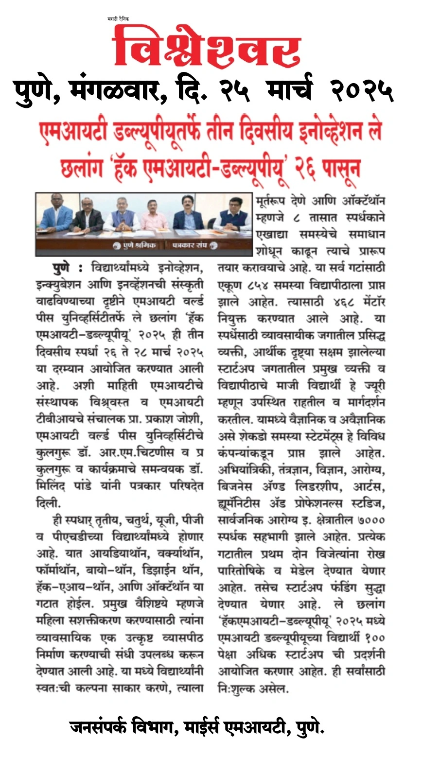 Pro Vice Chancellor Office, MIT World Peace University, Kothrud, Pune – 411 038 Maharashtra, India